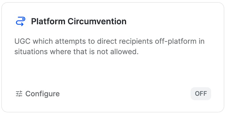 The Platform Circumvention engine can detect attempts at taking transactions off-platform, and can be used to block messages requesting contact details, or directing users to other platforms. This works even when users try to mask this behaviour.