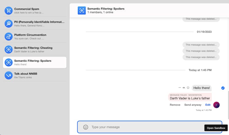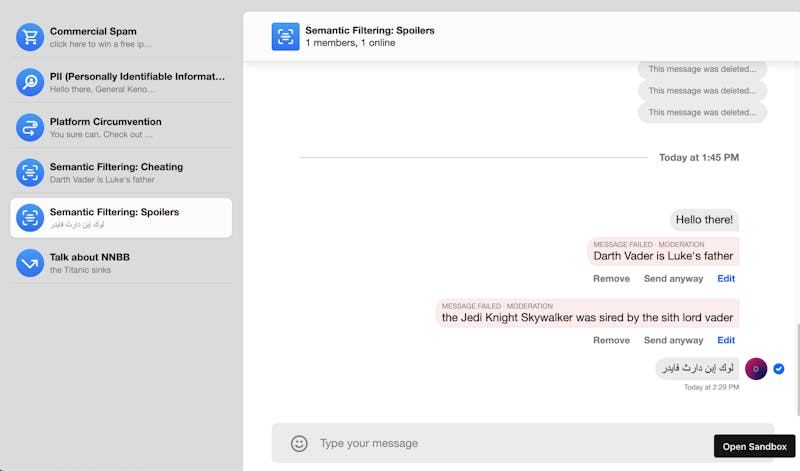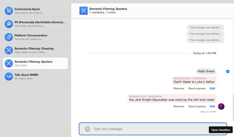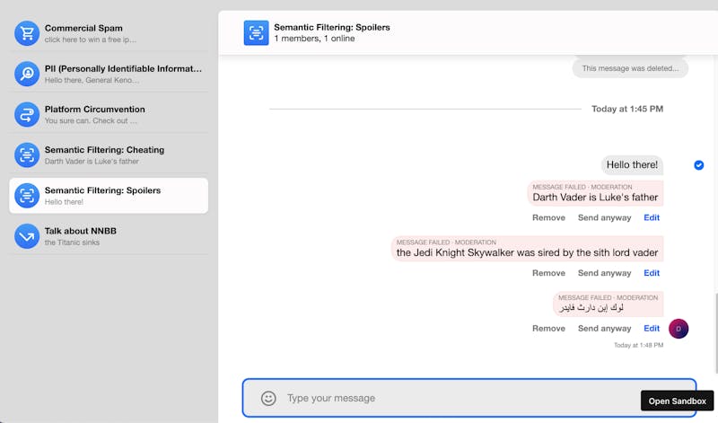 In the above demonstration app, we have expanded upon the default functionality provided in the Stream SDKs when it comes to error handling, to give the user the option to edit the message or send it anyway.