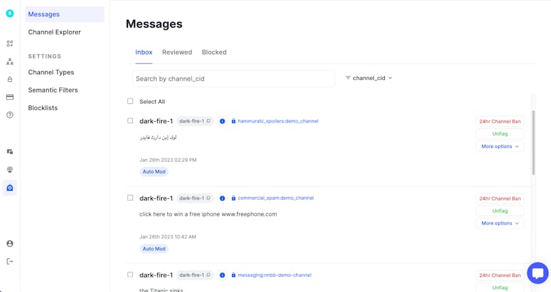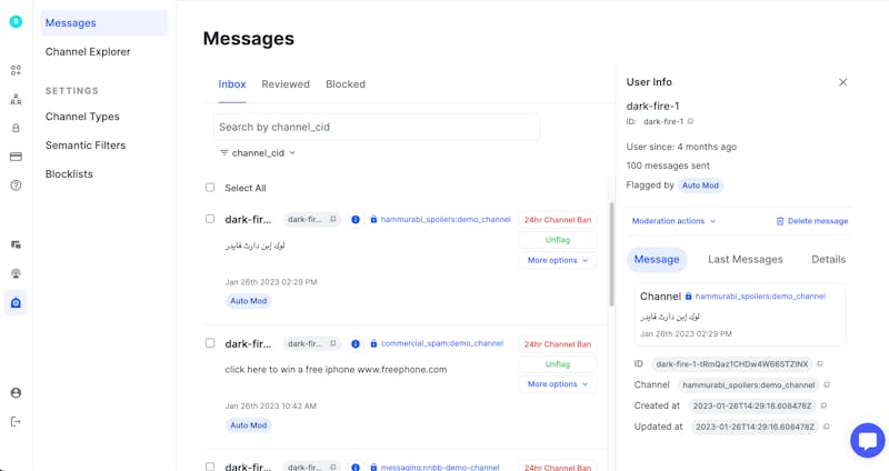 This message now shows up in the moderation dashboard, in the ‘Messages’ section: