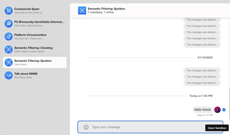 AutoMod Intent Designer is an AI-based moderation tool that can detect and action incoming messages in real time, based on their meaning and intent. Intent Designer does not require any software development, data science or machine learning skills to use. Instead, you provide Intent Designer with a list of example phrases corresponding to the meaning and intent you want to detect, and it will detect messages with similar meaning and intent to those example phrases, even across languages. You can change the phrases at any point through the moderation dashboard, and the changes will be reflected almost immediately.