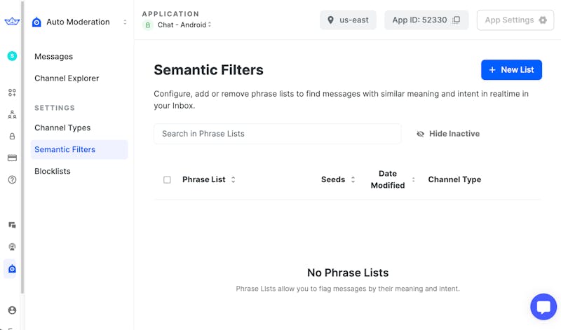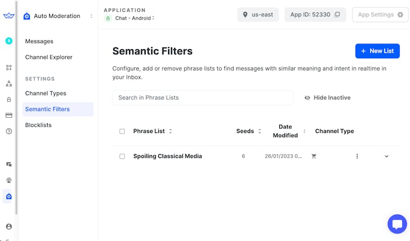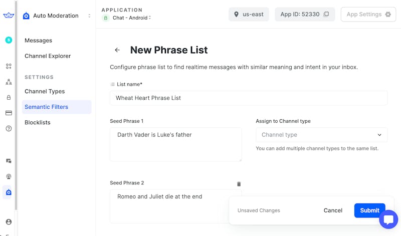 Press submit to activate the phrase list. This will save any changes made, and activate the phrase list on the selected channel types. Once submitted, it should appear on the Semantic Filters page: