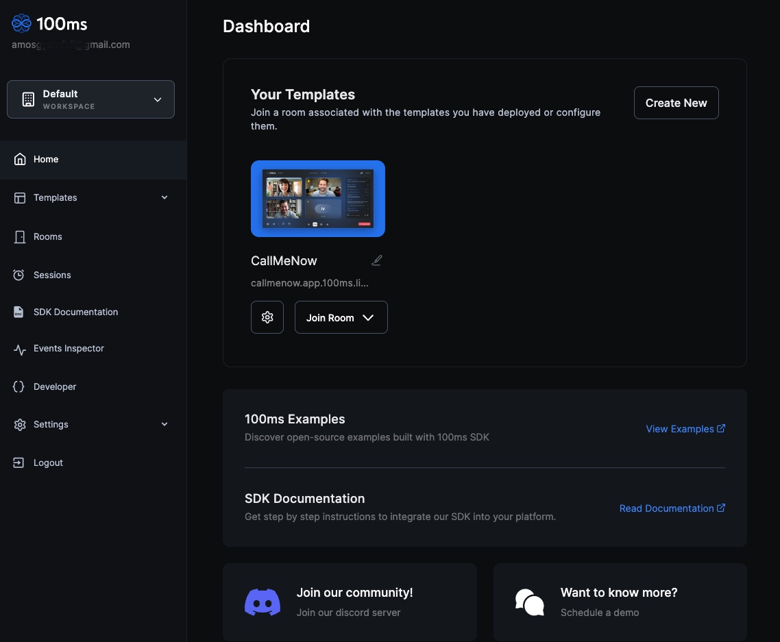 To integrate 100ms with your app, you need to set up a 100ms account. Head to their website and follow the steps to create a free account. The screenshot below shows an example 100ms dashboard account.