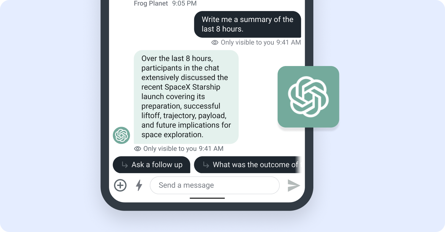 Integrate AI experiences into your messaging app with Stream, OpenAI's ChatGPT, or Google's Gemini for a strong foundation to build rich, engaging, tailored UX across all platforms and SDKs.