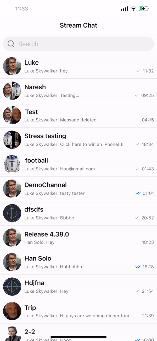 The ChatChannelListView is a reusable component that provides many features (pagination, swiping actions, search, etc), as well as customization options.